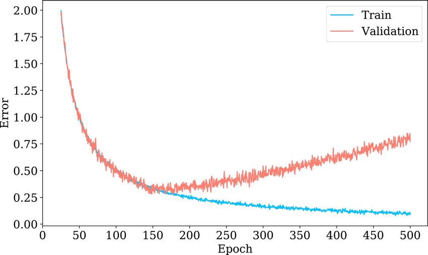 In the image above, we can observe that the validation error increases at approximately 150 epochs, which indicates that the model has started to overfit. We can conclude that small training error does not always imply good performance and an evaluation is needed to ensure accuracy.