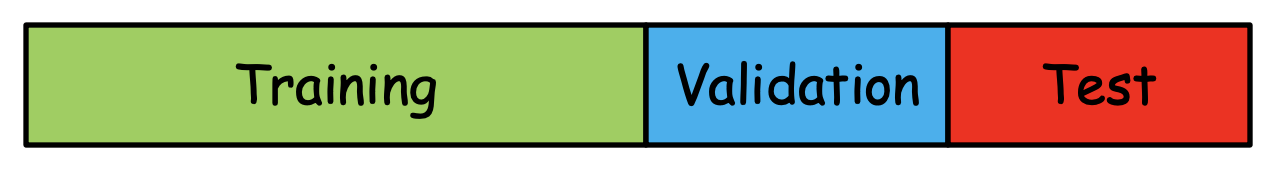 To determine when to stop and evaluate the neural network’s error properly, we need to use a portion of the dataset for training and another portion of data to set the stop point and another portion to evaluate those results without biased estimation. Each are called the training set, validation set and test set. The dataset can be split into 6:2:2, 7:1.5:1.5 or 8:1:1.