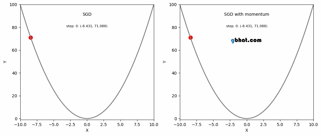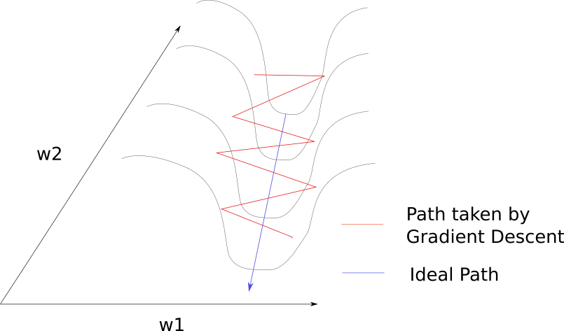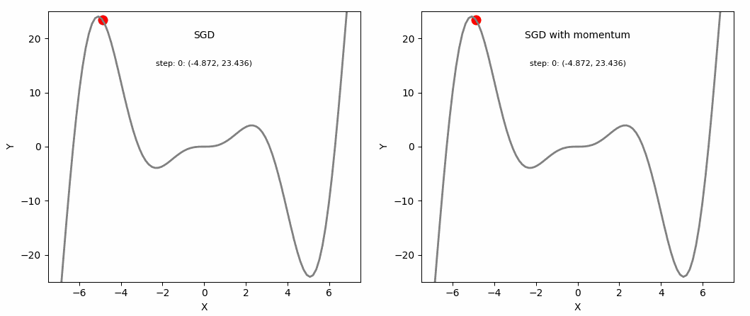 This is where momentum can be applied. Momentum is a technique that improves optimization quality. It can be thought of as a ball that rolls down the loss function. A simple gradient descent method will stop as soon as it reaches a local minimum, but with momentum applied, the point will keep moving even after reaching a local minimum and may reach a lower minimum.